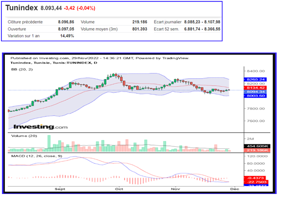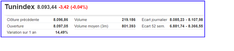 LA BVMT clôture la séance du mardi à l’équilibre (-) ; Tunindex 8.093,44: (-3.42 pts) ; -0,04%.