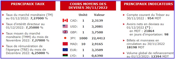 Taux du marché monétaire (TMM) au 01-12-2022 : 7,27000% ; Taux d’intérêt directeur au 01-12-2022 : 7,25% ; Taux moyen du marché monétaire (TMM) du mois de novembre 2022 : 7,27000%.