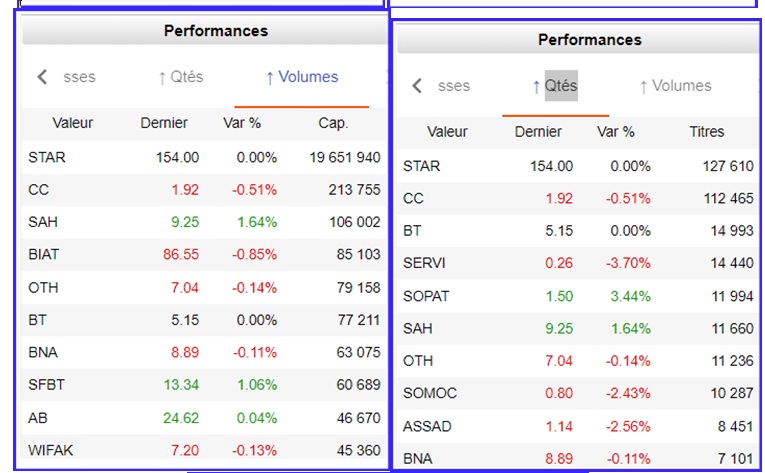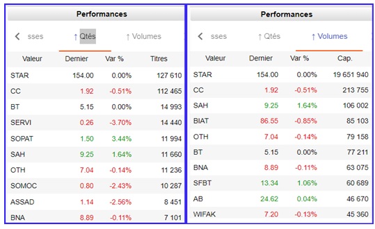 L’indice de référence de la BVMT s’inscrit en territoire négatif, dans des volumes fluctuants, autour d’une moyenne hebdomadaire de 753 K. titres échangés, selon les panneaux, négociations en blocs comprises.