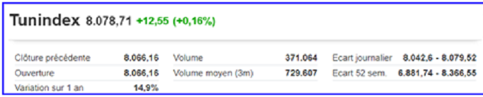 La BVMT ouvre la semaine dans le vert avec un Tunindex à 8.078,71 pts ; +12,55 pts (+0,16%)