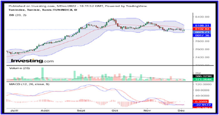 D’un point de vue graphique, on retiendra que le TUNINDEX se positionne encore dans un canal de CONSOLIDATION BAISSIERE), mais avec une propension à la reprise vers le milieu des Bandes de Bollinger (BB 20-2), comme le matérialisent le graphique en chandelier ci-dessus et le MACD qui lui est associé.