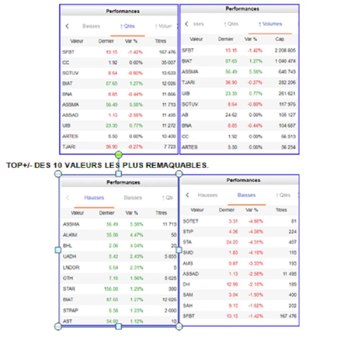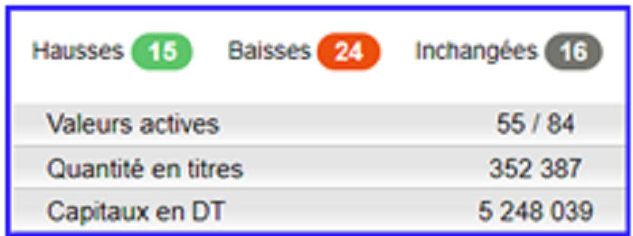 Sur 55 panneaux actifs, 15 sont en hausse, 24 sont en baisse et 16 inchangés, pour plus de 352 K titres et près de 5.248 MDT de transactions.
