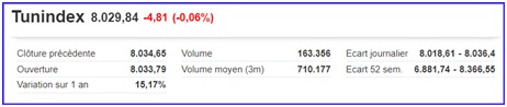 Le Tunindex, 8.029,84 (-4,81 pts) -0,06%, termine la séance du jeudi 08/12, à l’équilibre (-). La BVMT creuse sa dépression en continuant de prendre de la distance avec le seuil à 8050 pts. Elle amplifie son trend pour clôturer la séance de jeudi dans le rouge.