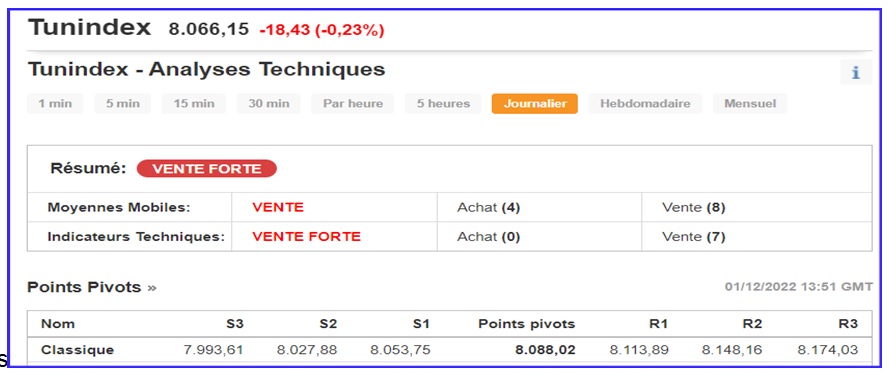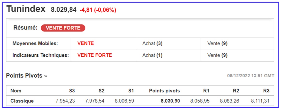 Pour un Point Pivot de 8030,90pts, le TUNINDEX se retrouve en-deçà de son point pivot, avec :
