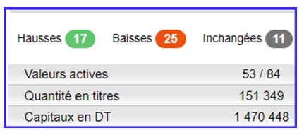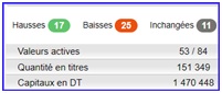 Sur les 53 panneaux actifs, 17 sont en hausse, 25 sont en baisse et 11 sont inchangés.