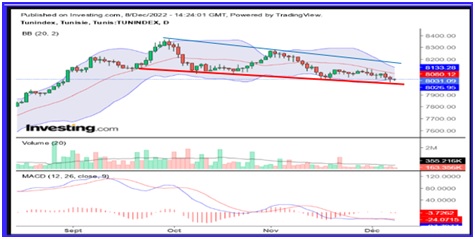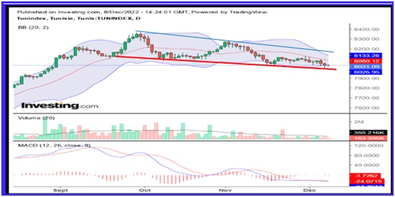 Les analyses graphiques et techniques confirment le positionnement du Tunindex au milieu du canal baissier(8000-8050 pts) et au plus bas des Bandes de Bollinger, avec une fiabilité forte.