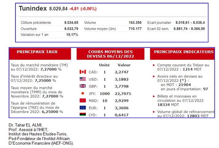 - Le Taux du marché monétaire (TM) (au 07/12.) est à 7,2700 %; le Taux d’intérêt directeur au (07/12) à 7,25000 %; et que le Taux moyen du marché monétaire (TMM) du mois de novembre 2022 est lui à 7,27000 %.