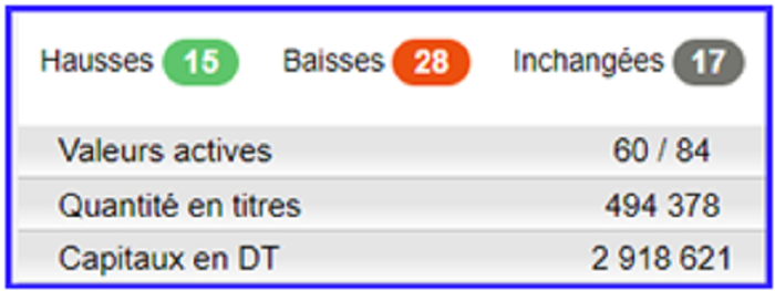 Sur 60valeurs actives, 15 sont à la hausse, contre 28 à la baisse et 17 inchangées.