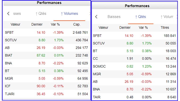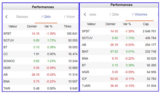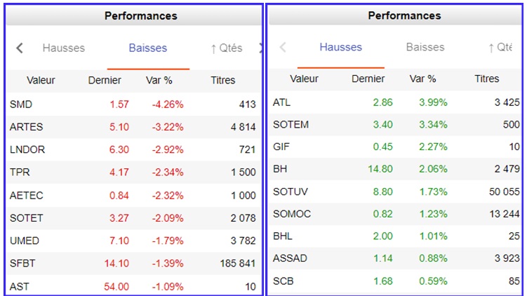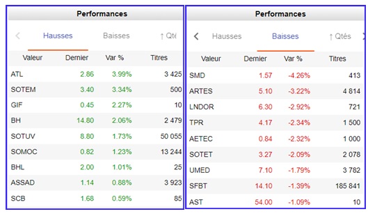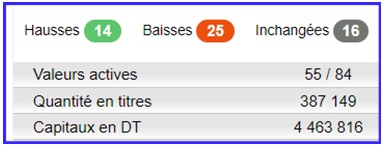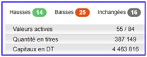 - Sur 55 valeurs actives, 14 sont à la hausse, contre 25 à la baisse et 16 inchangées.