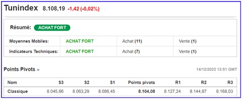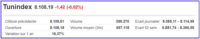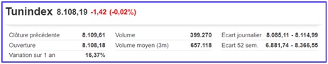 Le TUNINDEX : 8.108,19 : (-1,42 pts), (-0,02%) se stabilise au delà de son seuil soutien à 8100 pts, en attendant les décisions de la Banque Centrale pour la poursuite de la politique monétaire à venir, dans un contexte de politiques fiscales et budgétaires restrictives. Les opérateurs en bourse s’inquiètent de la dérive lancinance de la situation économique et sociale en Tunisie. Retour sur les données de la BVMT.