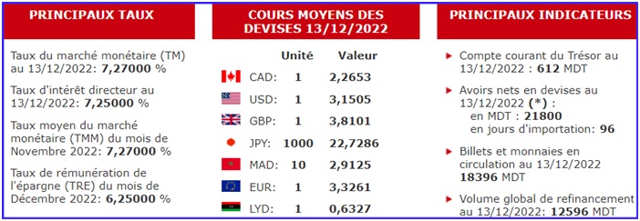 - Les billets et monnaies en circulation en légère hausse à : 18396 MDT, au (13-12).