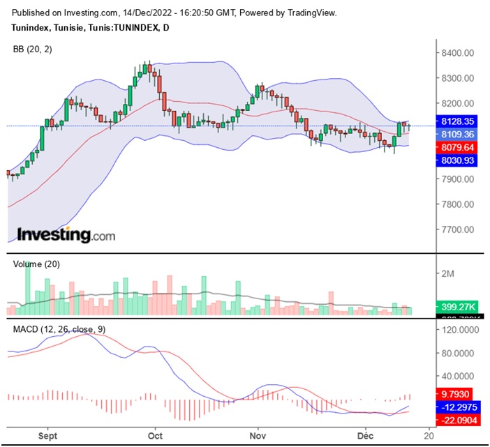 Devenu vendeur depuis le12 décembre (MACD en territoire positif, notamment), la BVMT s’installe en haut d’un canal transitoire à (8080–8130) pts, comme le montrent le graphique en chandeliers et les indicateurs (BB, MACD) associés, ci-dessus.