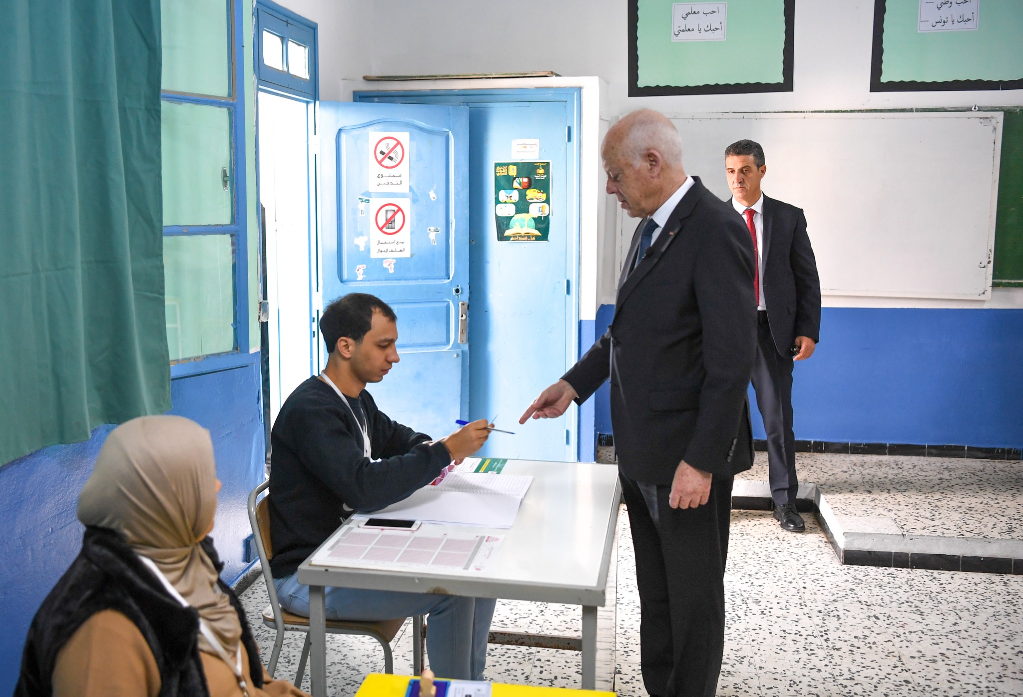 Le président de la République Kaïs Saied et son épouse ont voté aujourd’hui samedi en début de matinée à l’école primaire Cité Ennasr 1 à Tunis pour les élections législatives 2022.