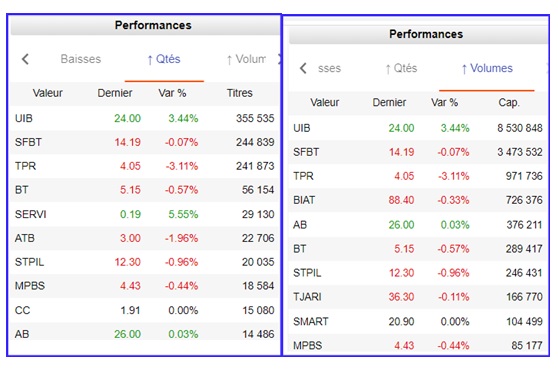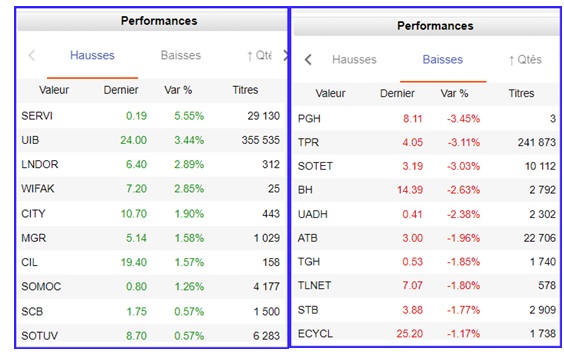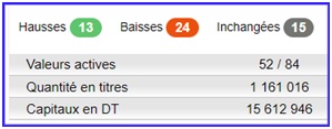 Sur 52 valeurs actives, 13 sont en hausse, contre 24 en baisse et 15 inchangées, pour près de 1,161 M. titres et plus de 15,6MDT de transactions.