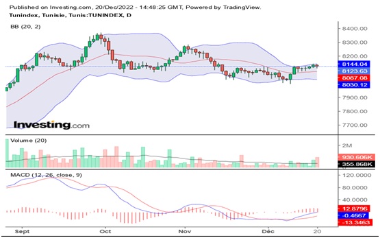 BVMT : d’un point de vue graphique, on ne retiendra que le franchissement haussier du seuil des 8120 pts et le maintien du Tunindex au-delà, dans un canal 8120-8150pts est positif.