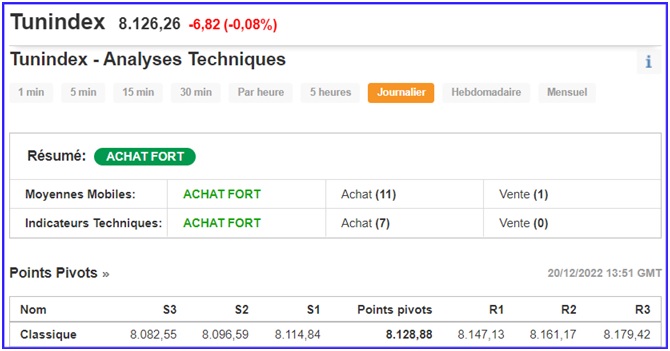 Le consensusCompte tenu de la conjoncture économique et financière de fin d’année, du climat sociopolitique et du sentiment des investisseurs en BOURSE, nous optons pour « ACHAT FORT».