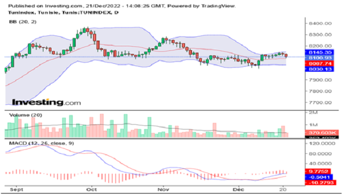 Devenu vendeur depuis le19 décembre (le MACD, pourtant en territoire positif), laBVMTs’installeenretraitdans canal baissier transitoireà (8100–8120) pts, comme le montrent le graphique en chandeliers et les indicateurs (BB, MACD) associés, ci-dessus.