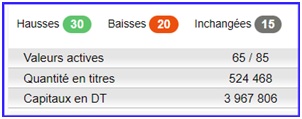 Sur les 65 panneaux actifs, 30 sont en hausse, 20 sont en baisse et 15 sont inchangés.