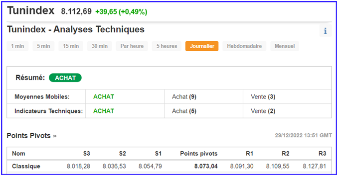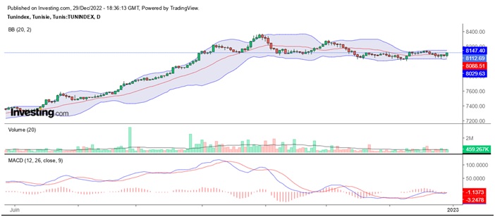 De fait, le Tunindex, se stabilise à la marge (+) du seuil symbolique à 8110 pts et au-delà de ses Moyennes Mobiles (MMA5J, MMA10J, MMA20J et de la MMA200J longue,), mais en-deçà desMMA50Jet MMA100J.A quelques deux jours de l’année 2023, le marché boursier de Tunis se retrouve sous une moindre pression macrofinancière mais avec un arrière-plan d’indécisions socio-économiques crédibles.Les analyses graphiques et techniques.
