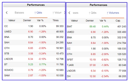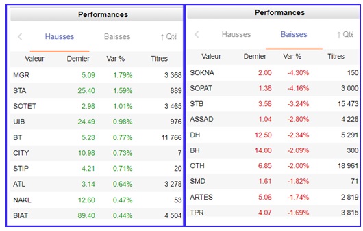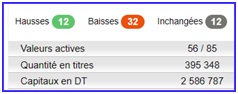 - Sur 10 valeurs actives, seulement 1 est en hausse, contre 7 en baisse et 2 inchangée.
