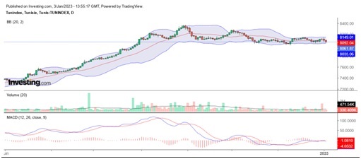 D’un point de vue graphique, on retiendra que le franchissement baissier du seuil des 8100 pts. Ainsi que le maintien du Tunindex en-deçà, dans un canal 8050-8080pts n’est pas positif.