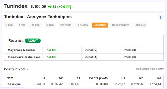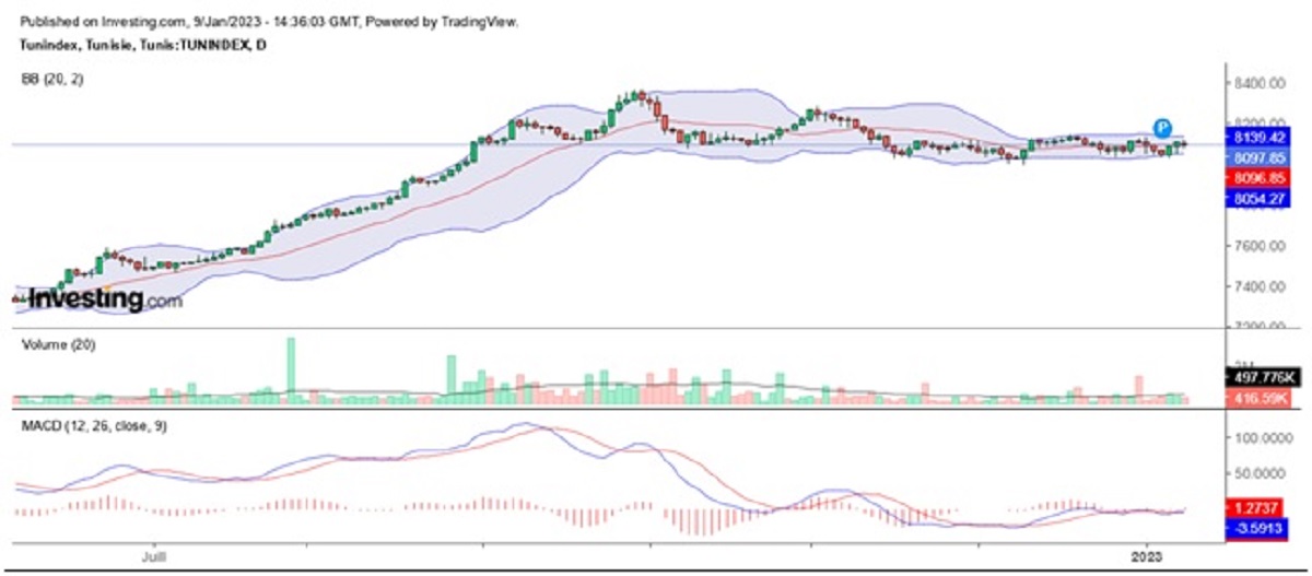 D’un point de vue graphique, on retiendra que le TUNINDEX consolide son renversement baissier pour se position envers le milieu des Bandes de Bollinger, avec une nette propension au retrait prudent, comme le matérialisent le graphique en chandelier ci-dessus et le MACD (devenu négatif) qui lui est associé. Le soutien (8070 pts), joue le rôle de seuil-support significatif avec une fiabilité forte au milieu de la semaine en cours.