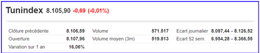 L’indice TUNINDEX qui avait ouvert la séance dans rouge, a clôturé les négociations à la marge(+) du seuil des 8105 pts.