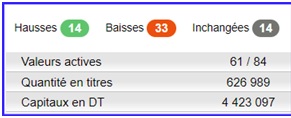 Sur 61 valeurs actives, 14 sont en hausse, contre 33 en baisse et 14 inchangées, pour moins de 627 M. titres et plus de 4.4 MDT de transactions.