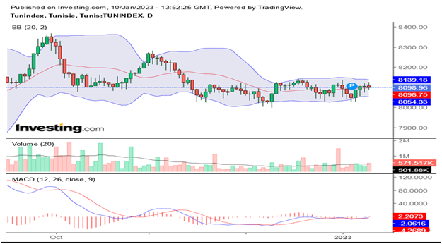 D’un point de vue graphique, on retiendra que le franchissement du seuil des 8100 pts et le maintien du Tunindex au-delà, dans un canal8080-8130ptsestmomentanément positif.