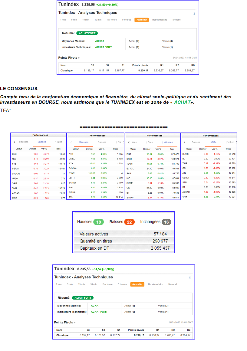 En tout état de cause, on retiendra que les franchissements successifs (+/-) du seuil des 8250 pts et le maintien du Tunindex dans un canal8200-8250ptsseraitglobalement positif avec une fiabilité moyenne.