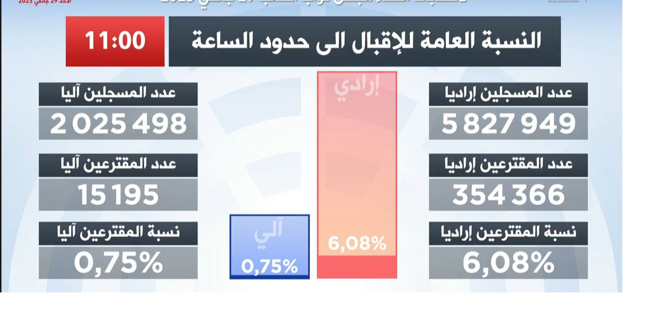 Farouk Bouasker a mentionné que le nombre des électeurs s’élève jusqu’à 11h 369 561 parmi 7 853 447 des inscrits aux législatives.