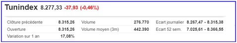 Après la baisse de 0.42% en clôture hier, le TUNINDEX affiche de nouvelles pertes ce mardi, avant des rendez-vous clés au cours des prochaines jours. L’indice TUNINDEX qui avait ouvert la séance dans le rouge, a clôturé les négociations en dents de scie, et en territoire négatif.