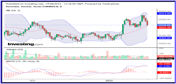 Devenu nettement vendeur depuis ledébut de la semaine en cours malgré un MACD en territoire positif, le marché boursier de Tunis s’installe en retrait dans un canal devenu baissier, étroit à (8200–8250) pts, comme le montrent le graphique en chandeliers et les indicateurs (BB, MACD) associés, ci-dessus.