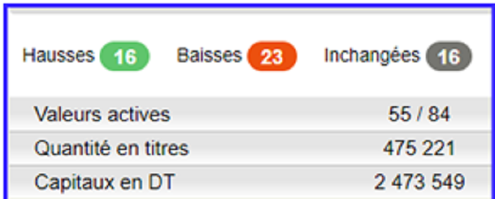 Sur 55 valeurs actives, 16 sont à la hausse, contre 23 à la baisse et 16 inchangées.