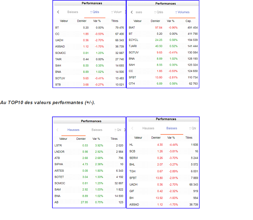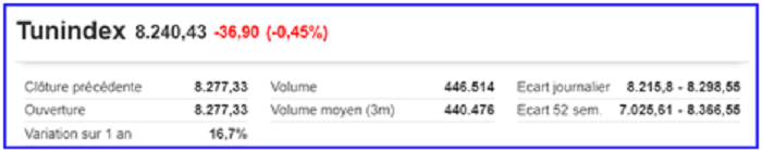 Après une clôture en baisse lancinante, le TUNINDEX revient pour se stabiliser en-dessous de 8250 points ce mercredi, en baisse de 0.45% à 8240.90 pts.