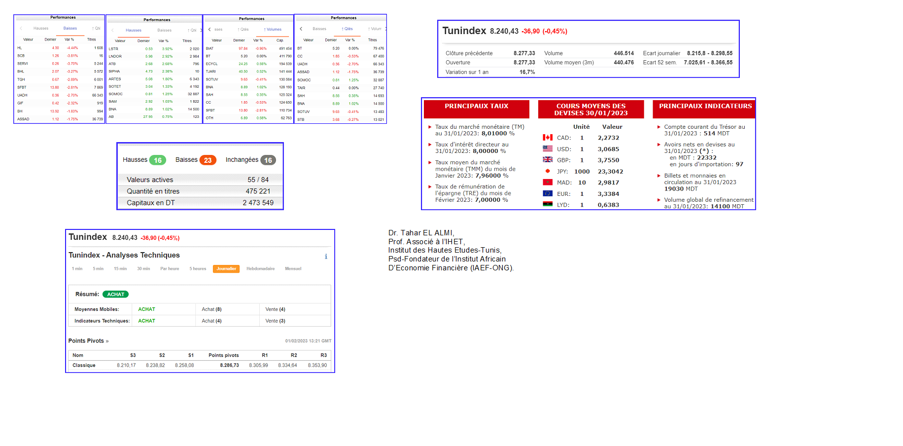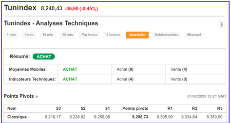 L’INDICE de la place se positionne très en-deçà de son Point Pivot (8286,73 pts),à la marge des 8240pts, avec une propension à la baisse (fiabilité moyenne à forte).