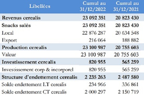Pour la société Céréalis, l’année 2022 a été une année de bonne performance pour la société. En effet, « les efforts commerciaux et la diversité du portefeuille produit ont permis à l’entreprise de trouver de la croissance sur le Chiffre d’Affaires et de clôturer l’année avec une hausse de 10,9 %, correspondant à un Chiffre d’Affaires de 23.1 MD », souligne Céréalis.