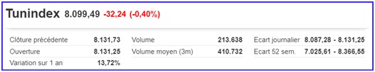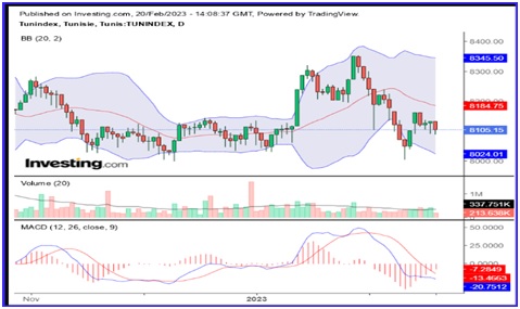 D’un point de vue graphique, on retiendra que le TUNINDEX semble vouloir mettre fin à son dernier renversement haussier pour franchir à la baisse son seuil symbolique à 8100 pts et se repositionner, dans la zone basse des Bandes de Bollinger, avec une propension au repli, comme le matérialisent la 3 dernières bougies du graphique en chandeliers ci-dessus.