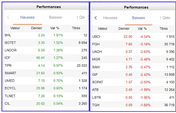 Les principaux composants du TUNINDEX ont clôturé la séance en ordre dispersé, avec une volatilité relativement moins élevée (ATR (14) : 65,2979%), sur un marché orienté au repli, malgré un soutien, à peine voilé, des opérateurs dans un marché orienté nettement à l’offre. Sur 57 panneaux actifs, 15 sont en hausse, 29 sont en baisse et 13 inchangés, pour 277K. titres et moins de 2.0 M.DT de transactions.