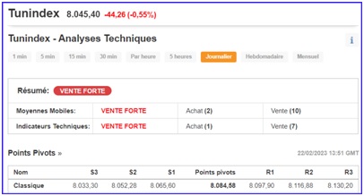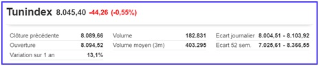 En séance, le TUNINDEX enfonce sa ligne de soutien à 8050 pts, pour se stabiliser à 8045.40points à la clôture de mercredi.