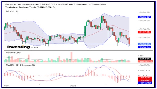 Redevenu vendeur depuis la mi-février, avec un MACD en territoire négatif, le TUNINDEX s’installe dans un canal baissier relativement large à (8000-8160) pts, comme le montrent le graphique en chandeliers et les indicateurs (BB, MACD) associés, ci-dessus.