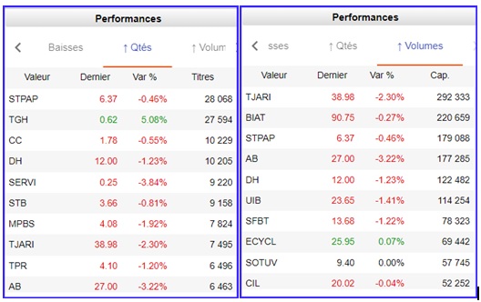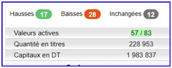 - Sur 57 valeurs actives, 17 sont à la hausse, contre 28 à la baisse et 12 inchangées.