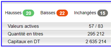 - Sur 57 valeurs actives, 20 sont à la hausse, contre 22 à la baisse et 15 inchangées.