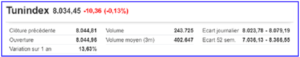 La Bourse de Tunis a ouvert ce mercredi en territoire négatif. Dans les premiers échanges, le TUNINDEX avaitcédé plusieurs dizaines de points, mais à mi-séance, il s’était repris pour limiter sa baisseet se stabiliser à la lisière de son seuil intermédiaire à 8035pts, en l’attente d’unefeuille de route de restaurationéconomique.