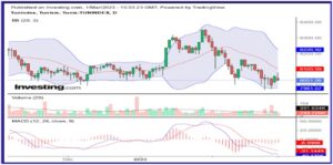 Devenu nettement vendeur(MACD en territoire négatif), le marché boursier de Tunis s’installe en retrait dans un canal devenu étroit à (8030–8050) pts, comme le montrent le graphique en chandeliers et les indicateurs (BB, MACD) associés, ci-dessus.