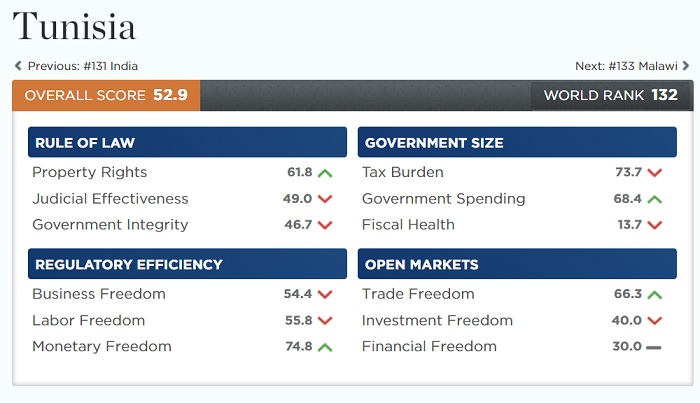 La Tunisie s’est classée au 132e rang mondial pour la liberté économique avec un score total de 52.9 points. Le score de la Tunisie est de 1.3 points de moins que l’année dernière. Dans la région MENA, la Tunisie est suivie par l’Egypte, le Liban, l’Algérie et l’Iran. Au Maghreb, la Tunisie est devancée par le Maroc (97e).