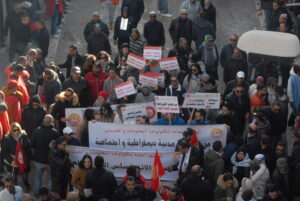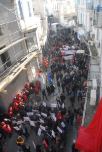 10h15, les manifestants, devancés par le secrétaire général et ses adjoints, commencent à s’avancer vers l’avenue Habib-Bourguiba, ensuite l’avenue de Paris, la rue Mokhtar-Attia avant de se rassembler devant le siège du gouvernorat de Tunis.