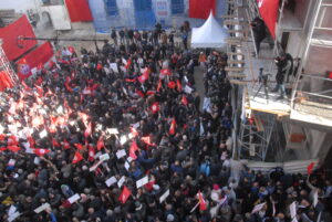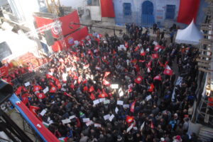Aux alentours de 10h00, l’ambiance commence à chauffer. En attendant le discours du secrétaire général, les syndicalistes ouvrent le bal avec plusieurs slogans. Le message est clair : « L’Ugtt est et restera un rempart contre toutes les dérives ». Une phrase qu’on entendra à maintes reprises ensuite lors du discours de Noureddine Taboubi, le S.G. de l’Ugtt.