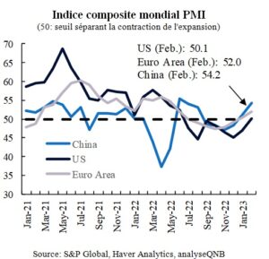 réouverture de l’économie, ces mesures ont rehaussé le PMI en territoire expansionniste qui devraient continuer à se redresser en 2023. Dans l’ensemble, malgré le ralentissement attendu de l’économie mondiale cette année, les économies avancées ont fait preuve d’une plus grande résistance, tandis que l’activité économique en Chine devrait connaître un rebond important.