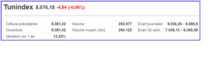 Le TUNINDEXfinit la semaine en cédantprès de 5 pts(-0.06%), juste à la marge (-) du seuil hautement symbolique des 8080 points.